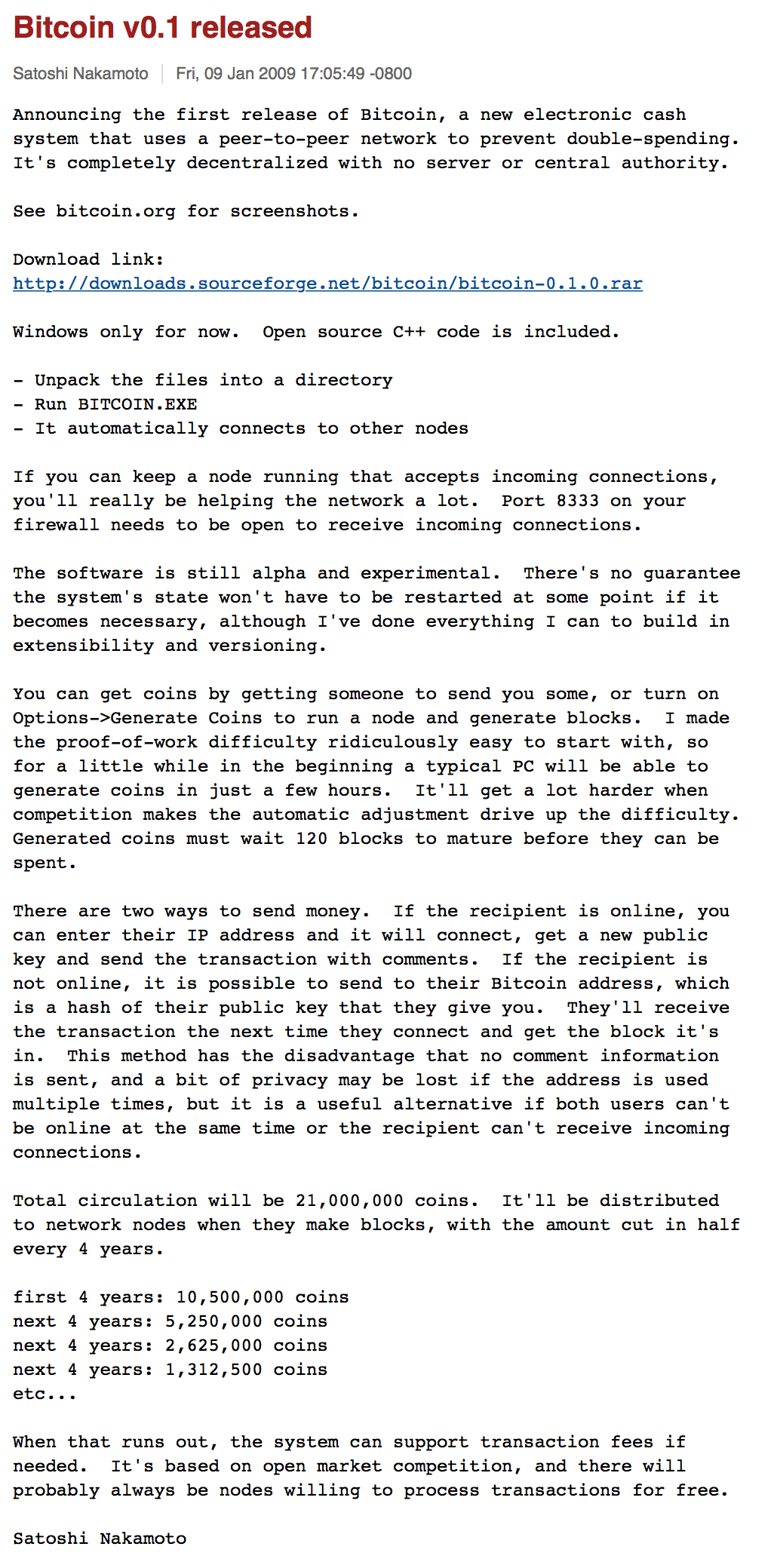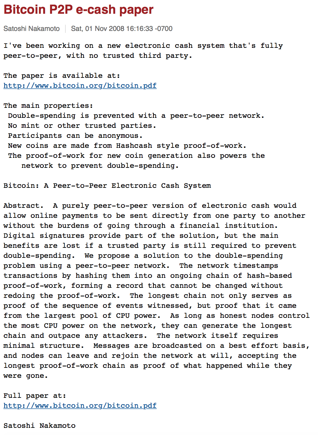 In oktober 2008 publiceerde Nakamoto een document waarin beschreven stond wat Bitcoin is en hoe het werkt, kort daarna in januari 2009 maakte Nakamoto de eerst werkende versie van de Bitcoin-software beschikbaar waarmee het Bitcoin-netwerk tot leven kwam en de eerste bitcoins gecreëerd werden.